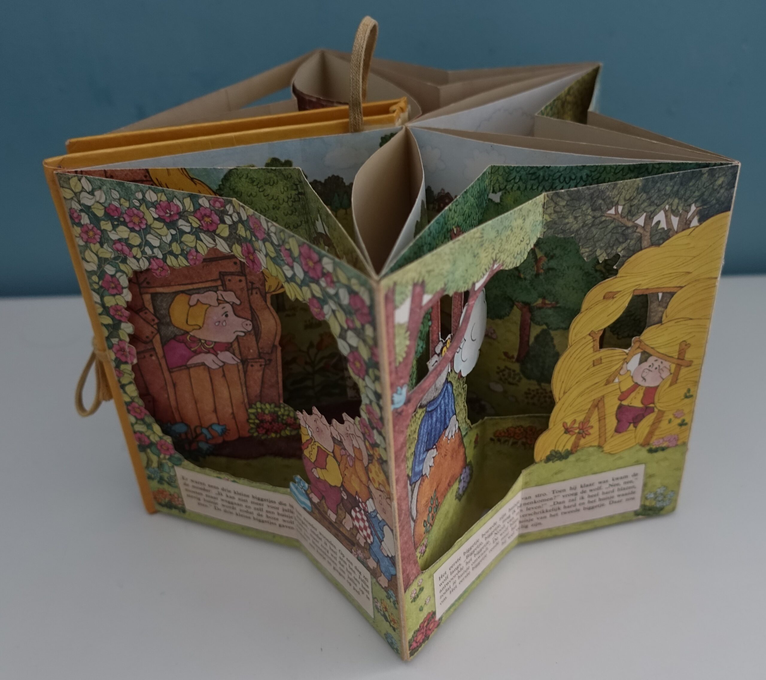 klein pop-up boekje van De drie kleie ebiggetjes uit de Carrousel serie; vouw het boek helemaal open en bind de voor-en achterzijde aan elkaar vast (en hang het op)