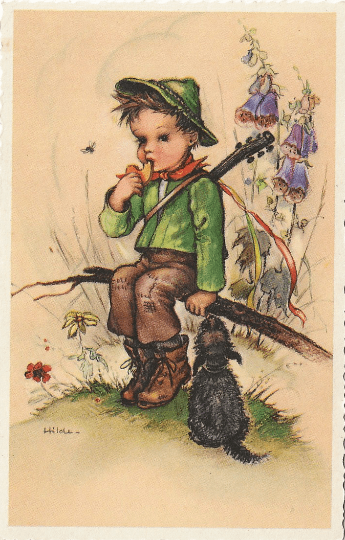 Jongen zit op tak – hondje – ill. Hilde