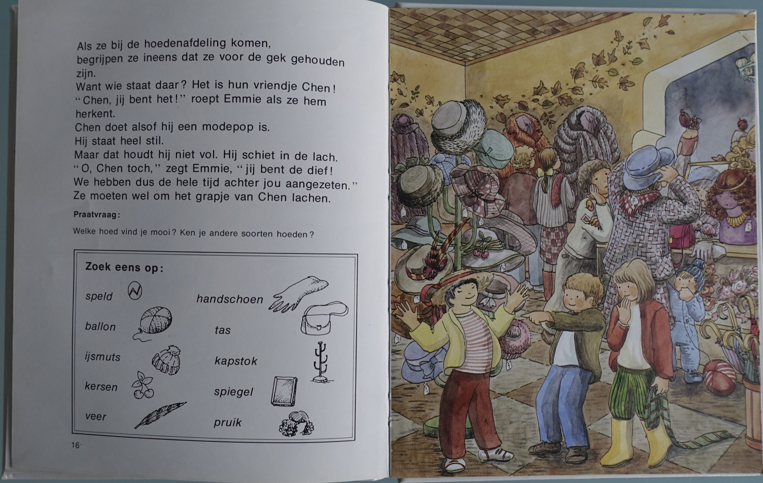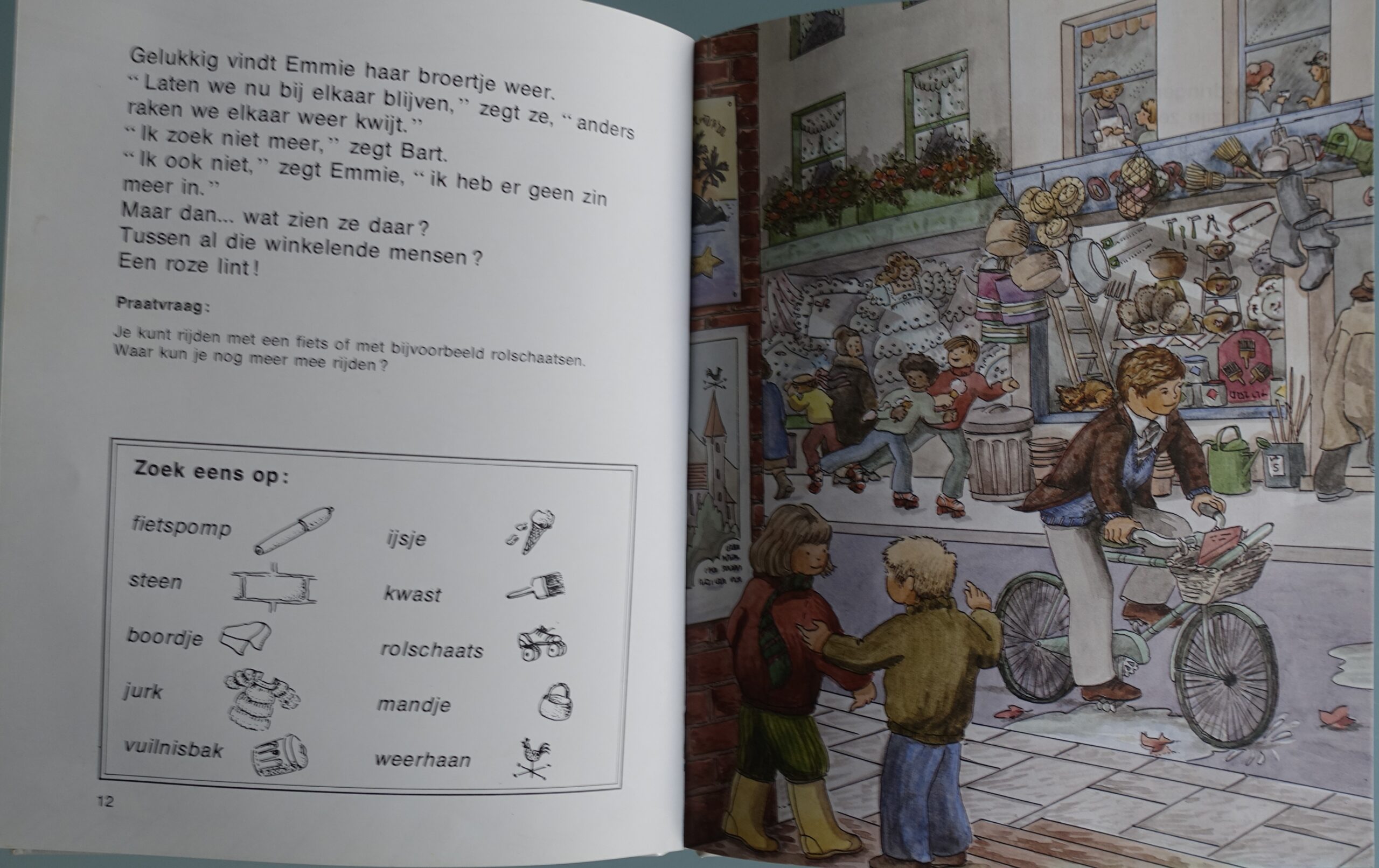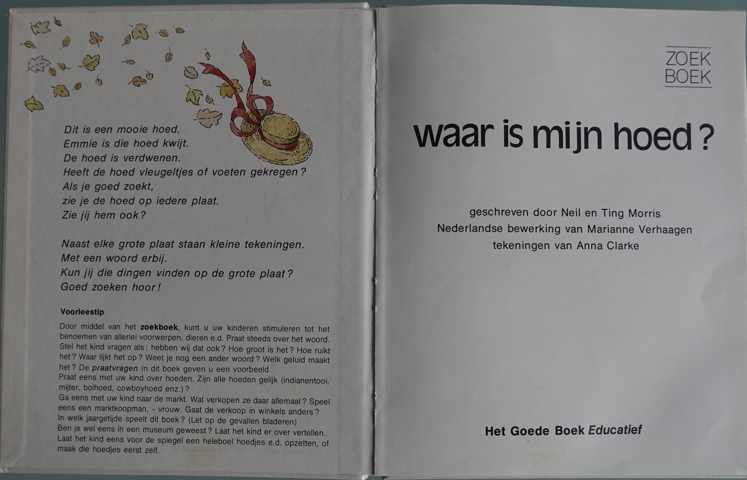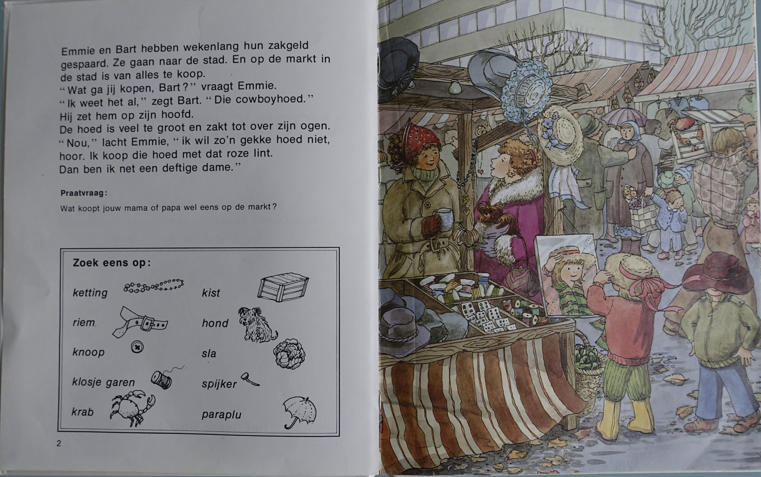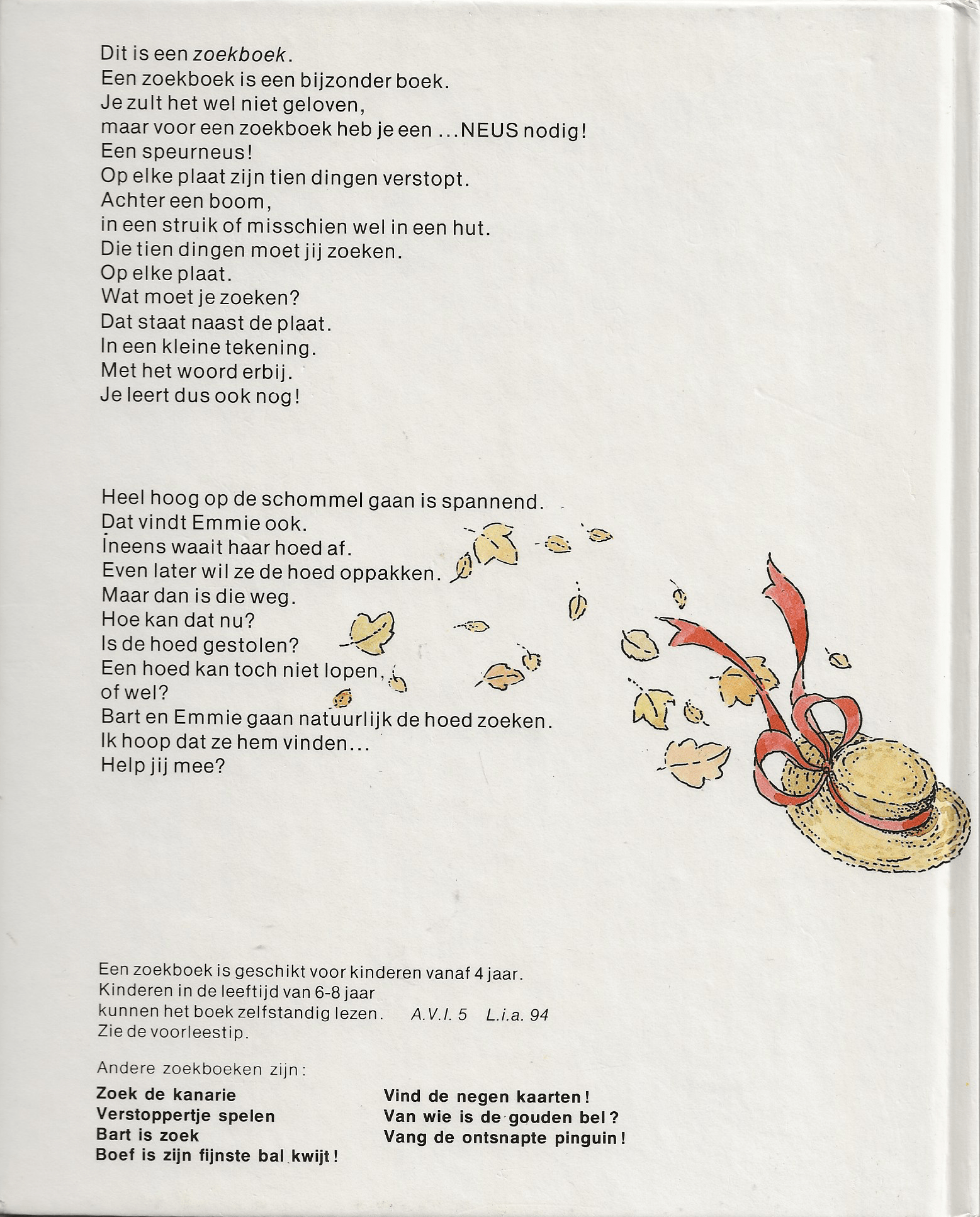 Zoekboek. Emmie en Bart gaan de weggewaaide hoed zoeken. Naast elke grote plaat staan kleine tekeningen. Met een woord erbij. Kun jij de dingen vinden op de grote plaat? Vanaf 4 jaar. Zelf lezen 6-8 jaar